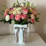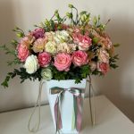 Шляпная коробка с садовыми розами Пинк Охара и маттиолой, розой Джульетта
