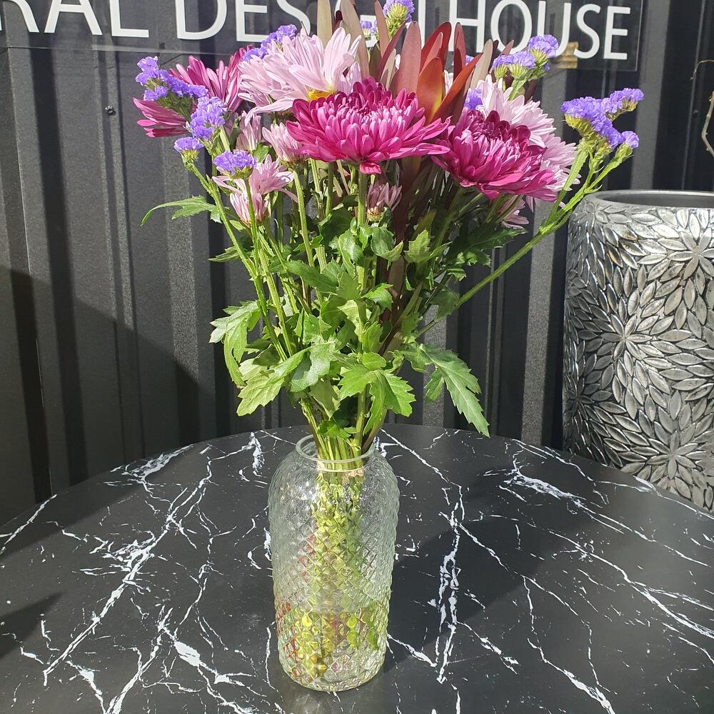 Хризантема кустовая – 5 шт. хризантема бигуди – 5 шт. Статица – 2 шт. левкадендрон – 3 шт.