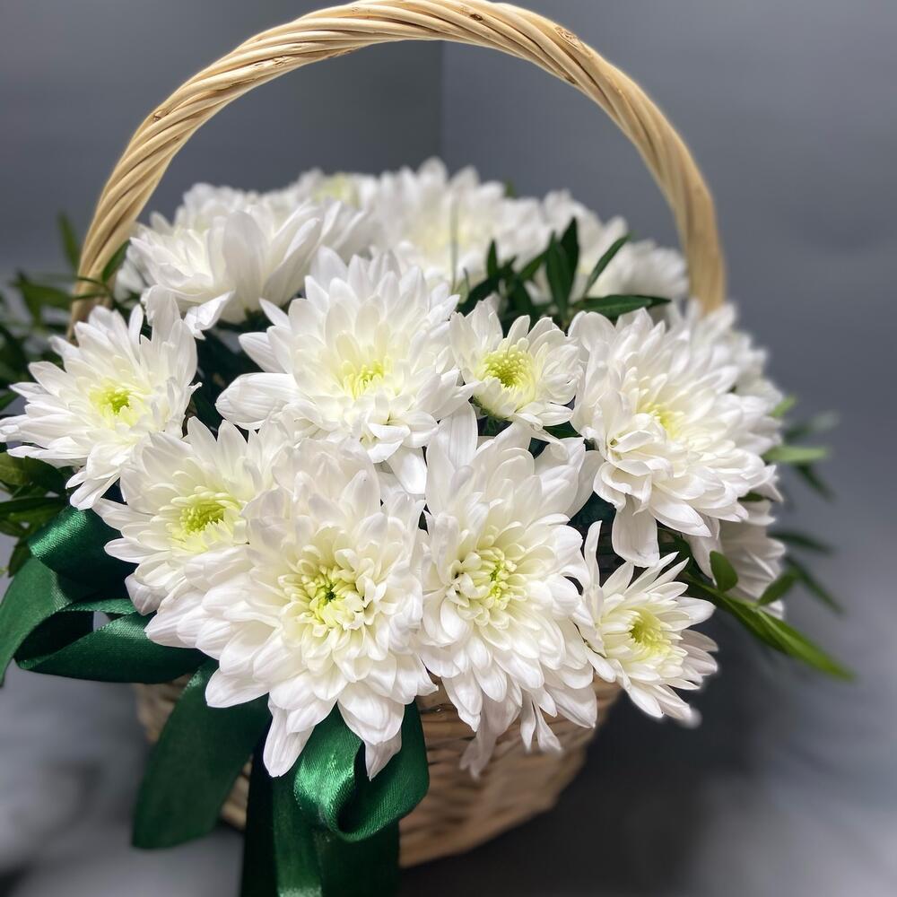 Хризантема кустовая – 7 шт.Зелень – 1 шт.Корзина плетеная – 1 шт.Оазис флористический – 1 шт.