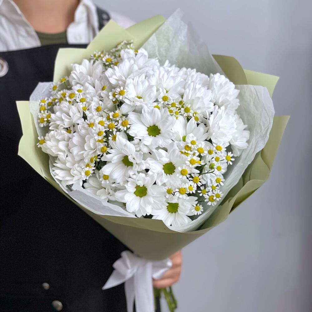 Букет из кустовой белой хризантемы и маленьких ромашек матрикарии – это воплощение летних дней и отличного настроения!Такой букет точно поднимет настроение в самый пасмурный день.А дополнительным бонусом будет невероятная стойкость