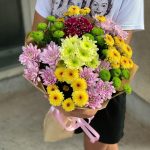 Хризантема кустовая желтая – 3 шт. Хризантема кустовая розовая – 3 шт. Хризантема зеленая кустовая – 3 шт. Хризантема кустовая бордовая – 1 шт. Хризантема кустовая лимонная – 1 шт.