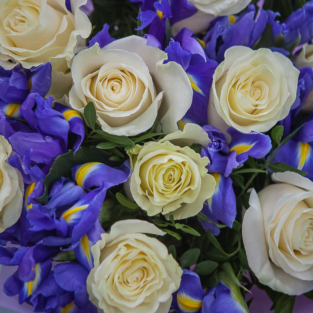 ирисы синие – 17 шт.розы белые – 9 шт.Упаковка матовая пленка – 1 шт.Атласная лента – 1 шт.