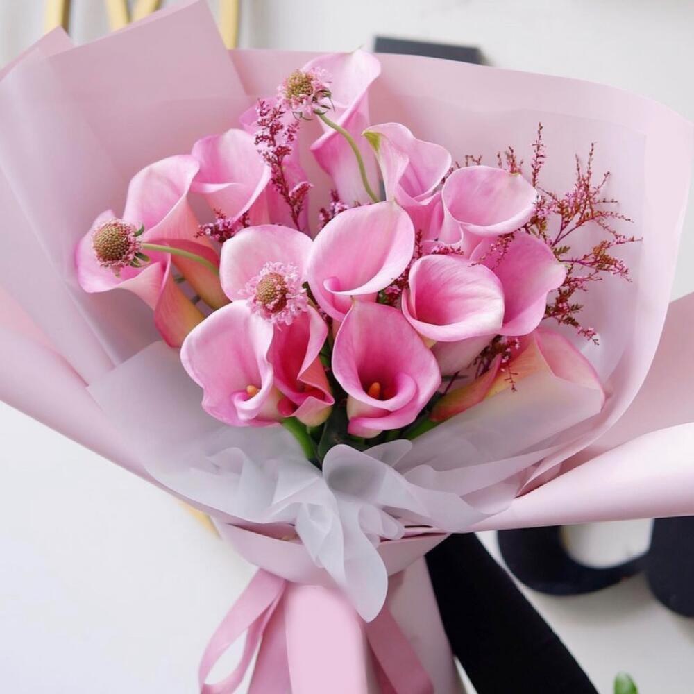 Калла розовая – 13 шт.декоративная зелень – 10 шт.Упаковка дизайнерская – 2 шт.Лента атласная – 2 шт.Открыточка с вашими пожеланиями – 1 шт.хорошее настроение – 100 шт.инструкция по уходу за цветами – 1 шт.коробка переноска – 1 шт.Кризал – 1 шт.