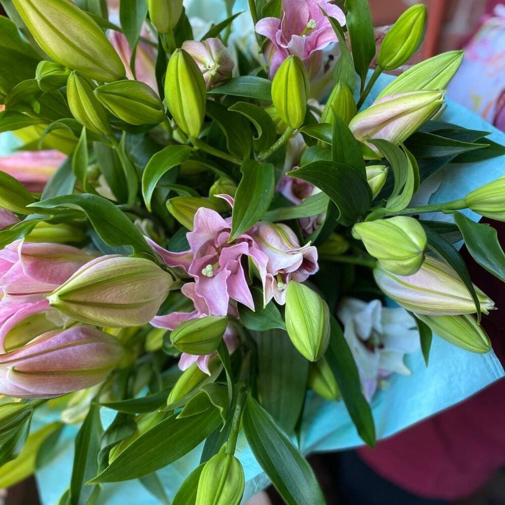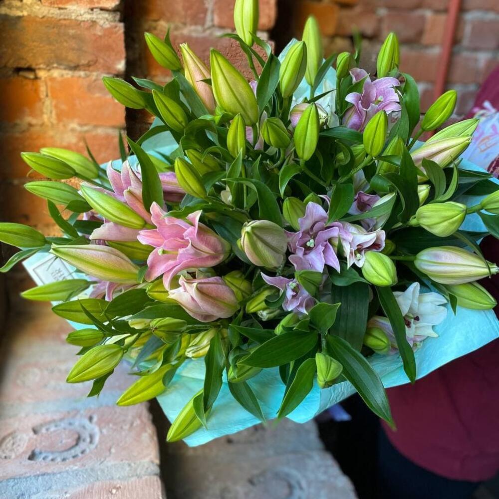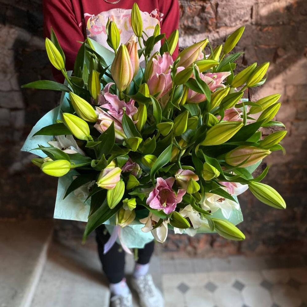 Букет из 19 белых и розовых лилий “Авеню”