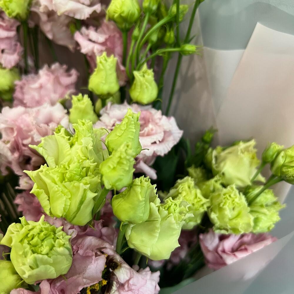 эустома алиса пинк – 7 шт.Упаковка дизайнерская – 1 шт.Атласная лента – 1 шт.