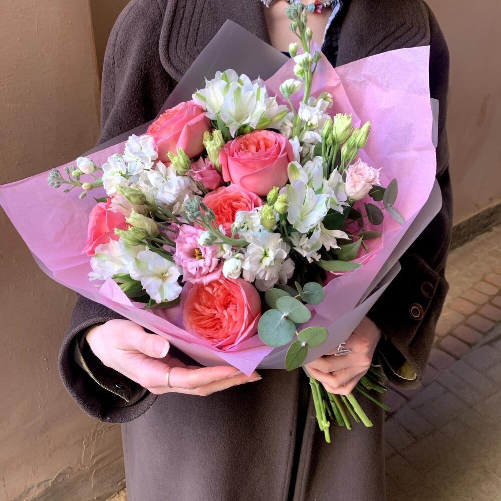 Альстромерия – 3 шт.Маттиола – 3 шт.Эвкалипт – 2 шт.Рускус сочи – 2 шт.Лизиантус розовый – 2 шт.Авторская упаковка – 1 шт.роза пинк экспрешн – 5 шт.