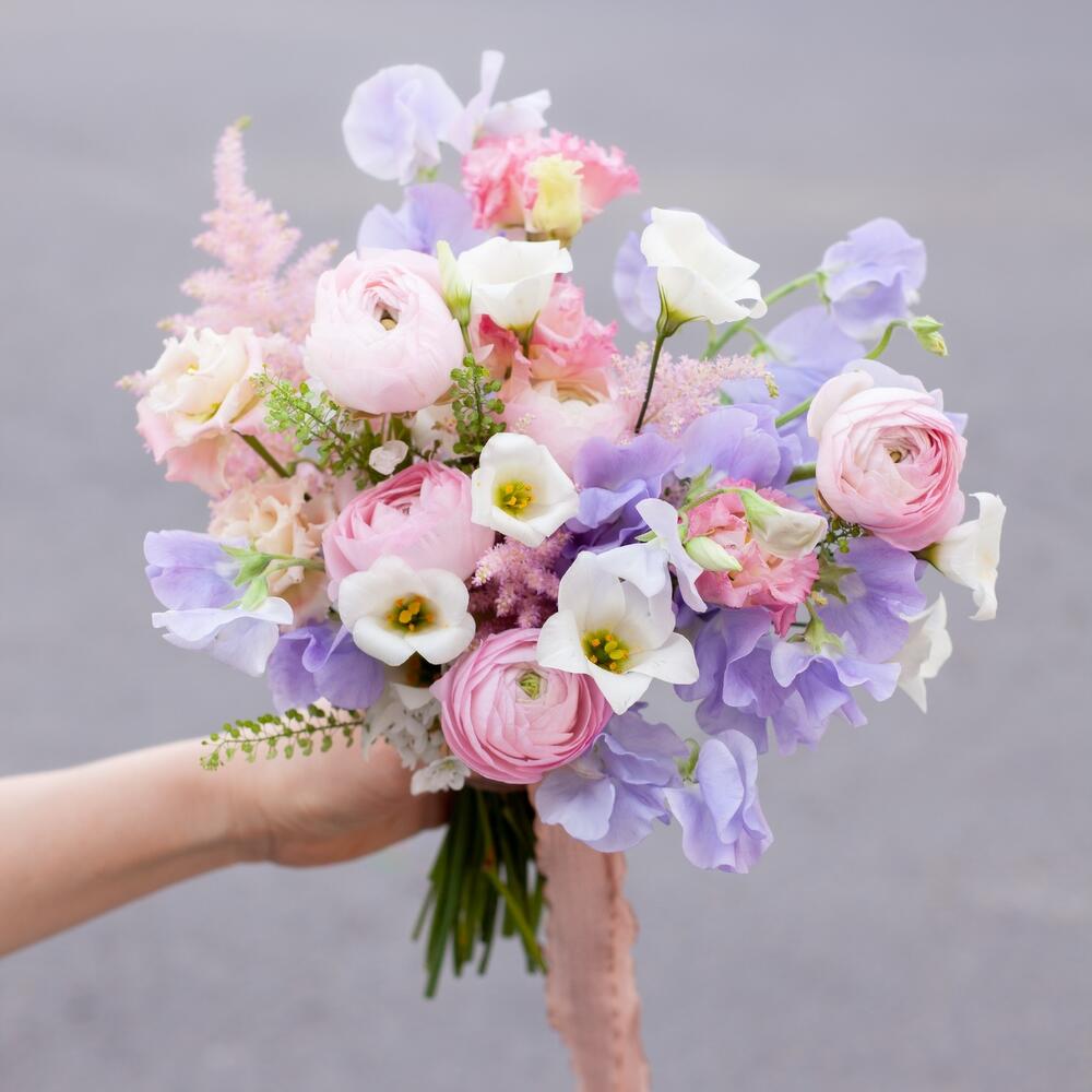 Ранункулюс розовый – 6 шт.Астильба – 5 шт.Латирус – 9 шт.Лизиантус – 4 шт.