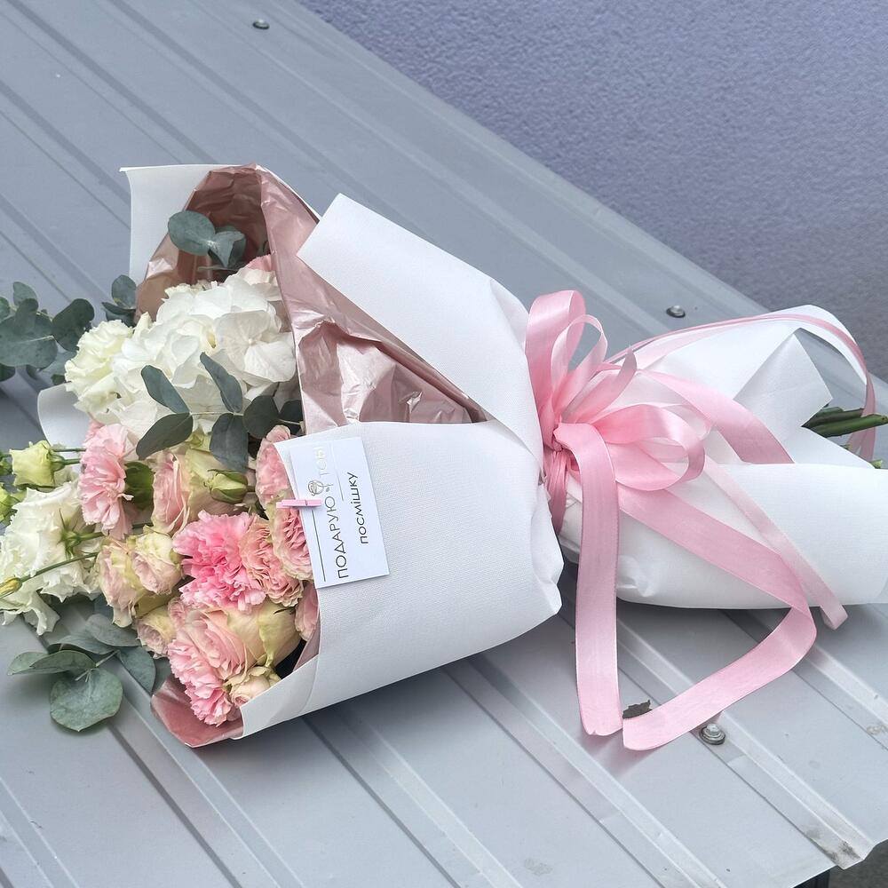 Гвоздики, Лизиантусы, Розы, Тюльпаны