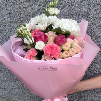 Ніжний букет в рожевих кольорах з гортензією неодмінно подарую усмішку вашій дорогій людині.