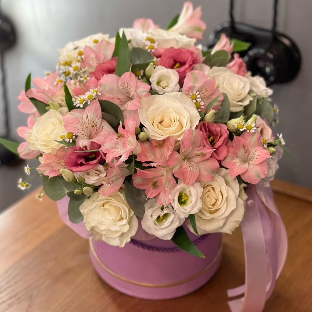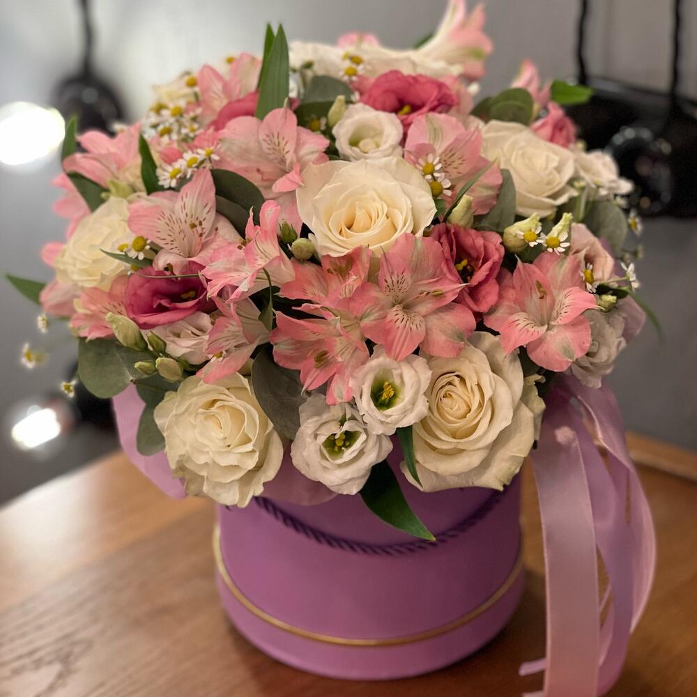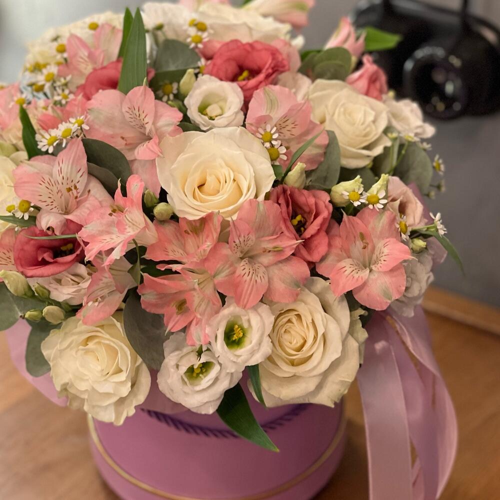 Стильная коробочка на день рождения или просто так, нежные цветы в коробке идеальное решение , для тех , кто не знает , что подарить. Цвет коробки может быть другими, по желанию изменен состав. Мы подпишем открытку и вовремя доставим адресату.