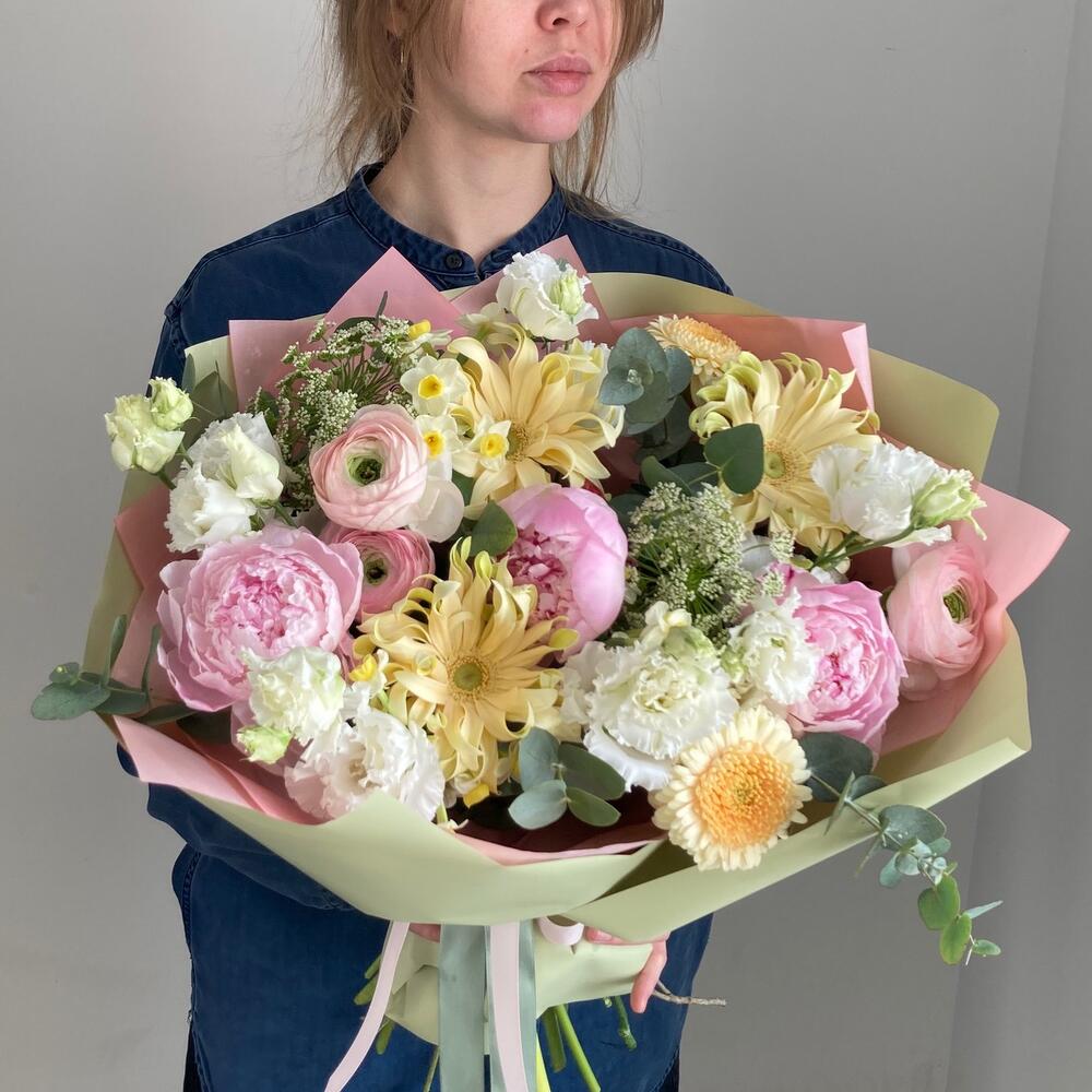 Пион – 3 шт.Ранункулюс – 3 шт.гербера кучерявая – 3 шт.Амми – 3 шт.Лизиантус – 3 шт.Нарцисс – 3 шт.Гербера мини – 3 шт.Эвкалипт – 6 шт.Упаковка – 1 шт.