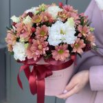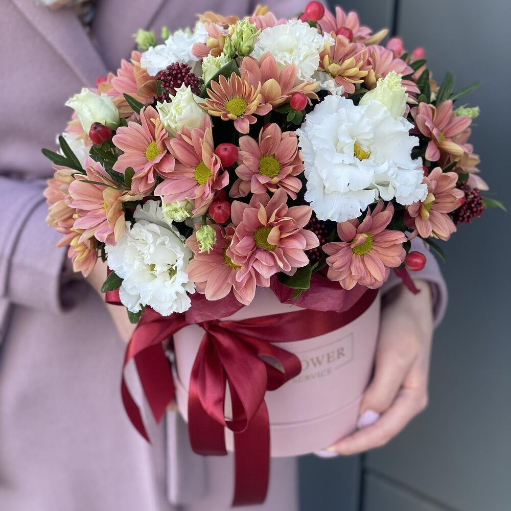 Коробка с цветами из ромашковой персиковой хризантемы, гиперикума, скиммии, зелени и кружевной эустомы !