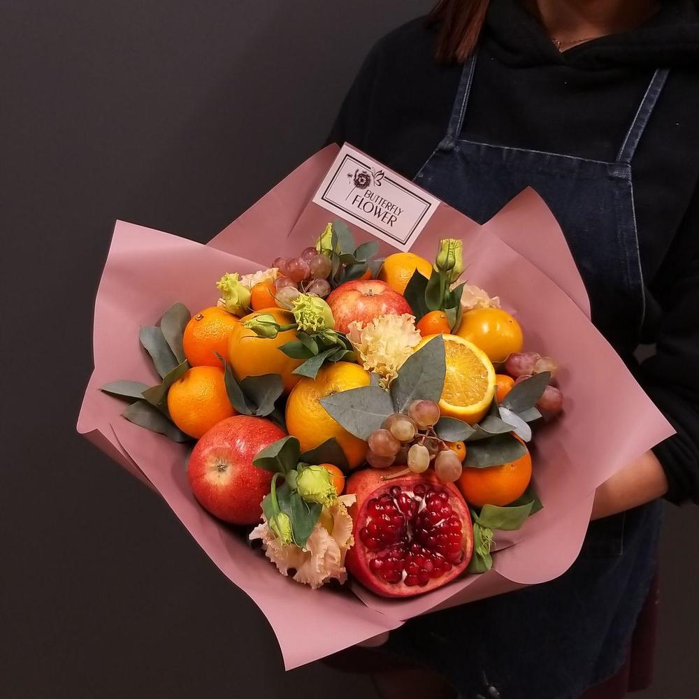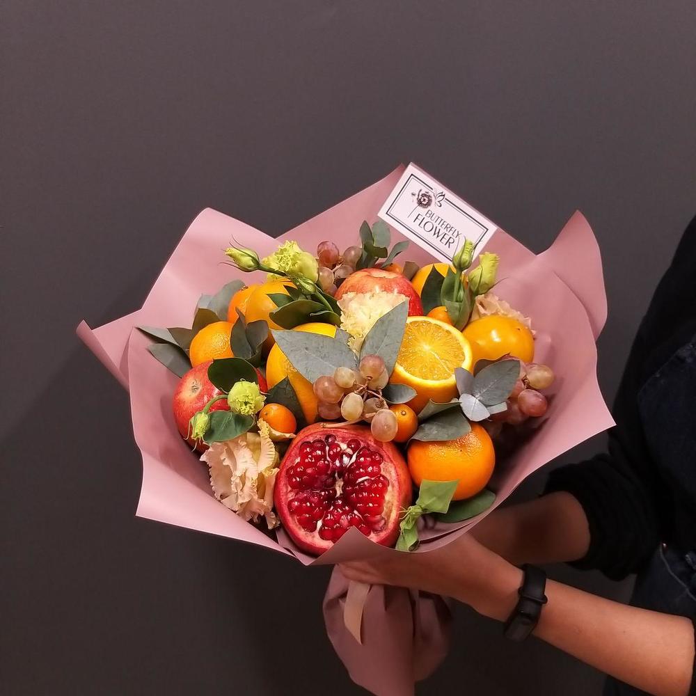 Лизиантус – 3 шт.Эвкалипт – 1 шт.Упаковка – 1 шт.Гранат – 1 шт.Яблоко – 2 шт.Апельсин – 2 шт.Мандарин – 4 шт.Хурма – 2 шт.Кумкват – 50 гр.Виноград гроздь – 1 шт.