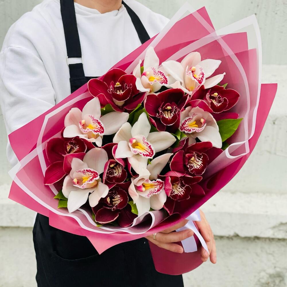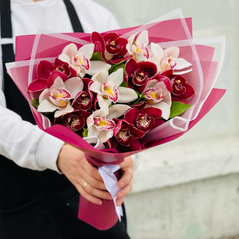 Орхидея Цимбидиум – 15 шт.Рускус – 15 шт.Лента атласная – 1 шт.Упаковка дизайнерская – 5 шт.удлинитель для орхидеи – 15 шт.