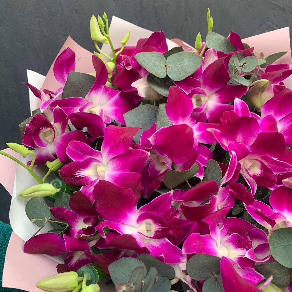 Дендробиум – 51 шт.удлинитель для орхидеи – 25 шт.Фисташка – 15 шт.Эвкалипт – 9 шт.Упаковка дизайнерская – 2 шт.Лента атласная – 1 шт.