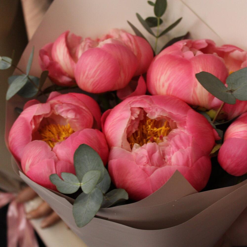5 коралловых пионов с эвкалиптом