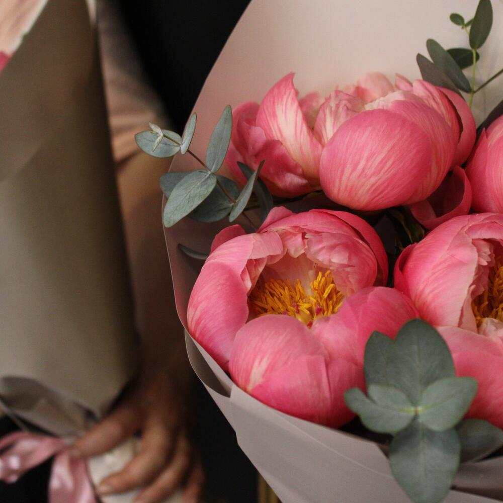Эвкалипт – 3 шт.Лента атласная – 1 шт.Пленка матовая – 2 шт.Пион коралл шарм – 5 шт.