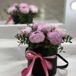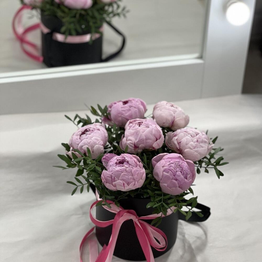 Лента атласная – 1 шт.Коробка шляпная – 1 шт.Пион Сара Бернар – 7 шт.Фисташка пучок – 1 шт.