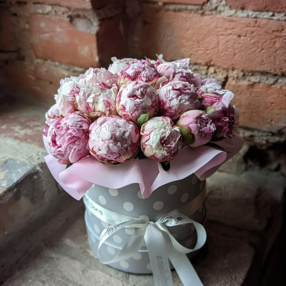 Букет из 19 розовых пионов в дизайнерской коробке “Сара Бернар”