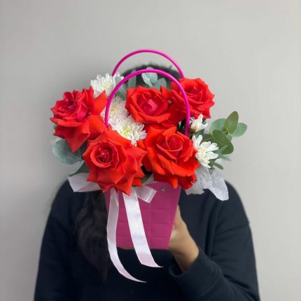 Композиция в сумке с лилией и розами