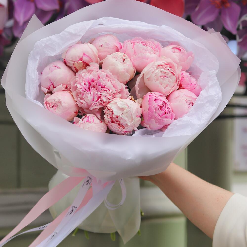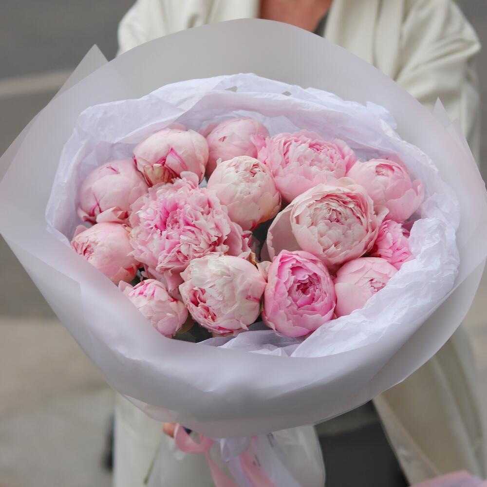 Открыточка с вашими пожеланиями – 1 шт.Шоколадка – 1 шт.Транспортировочная коробка – 1 шт.Розовый пион – 13 шт.Дизайнерская упаковка – 1 шт.подкормка для срезанных цветов – 1 шт.инструкция по уходу за цветами – 1 шт.