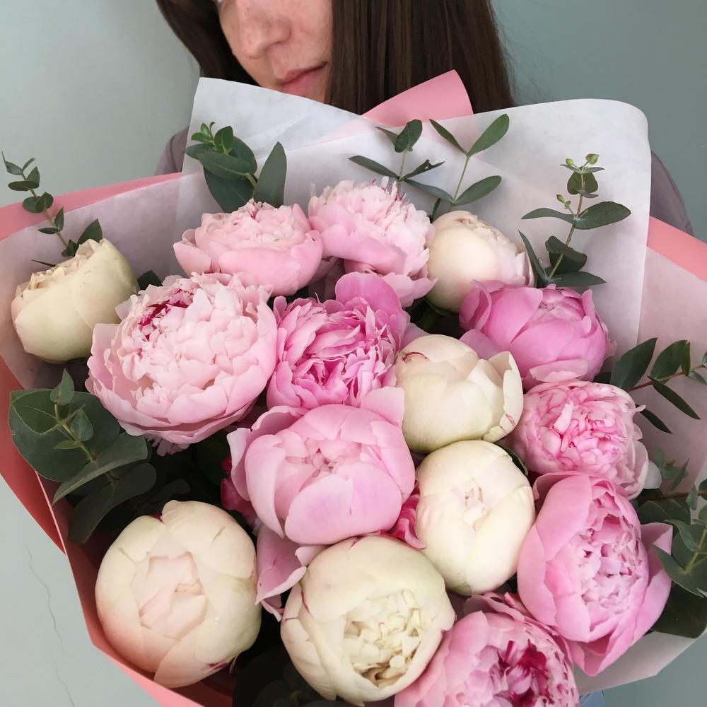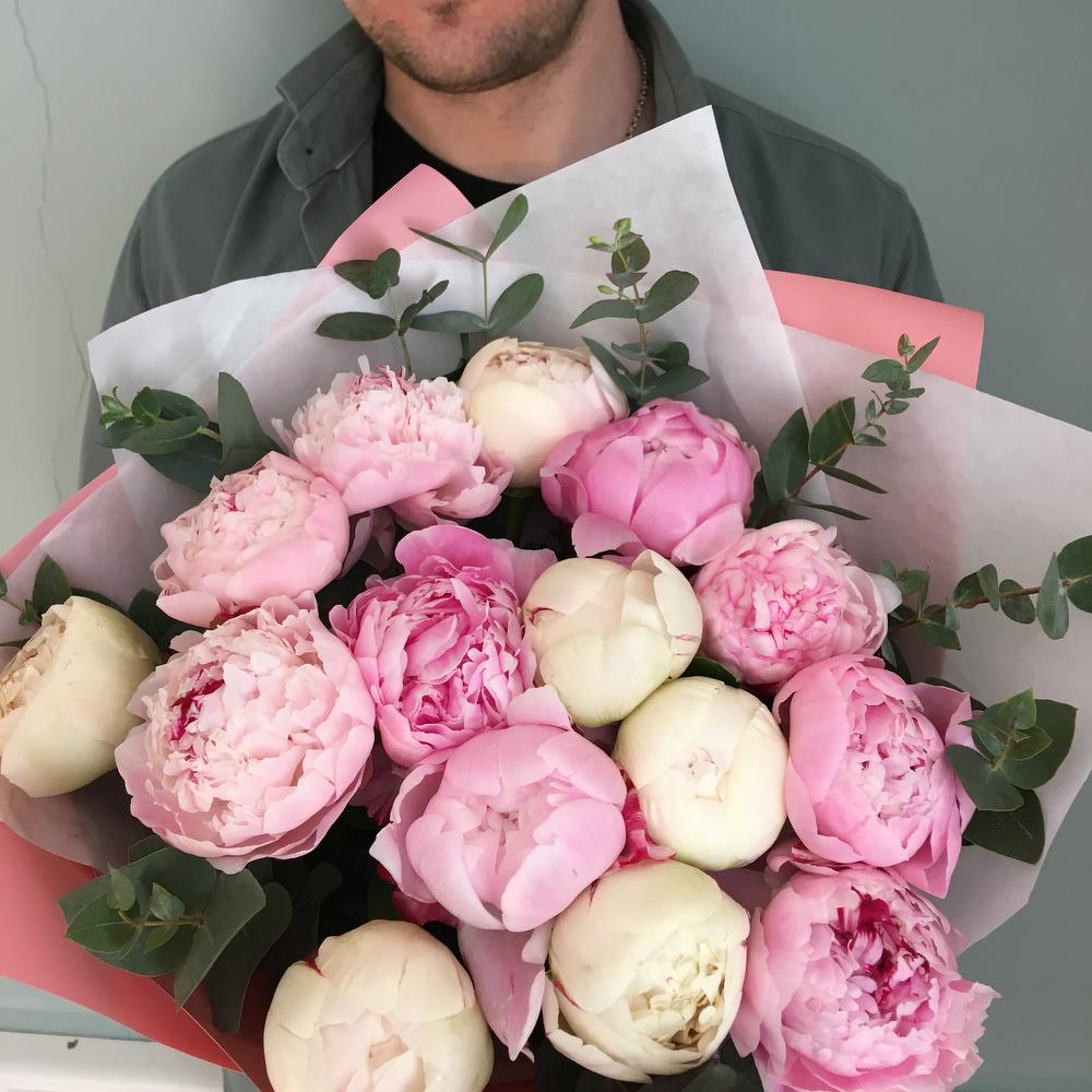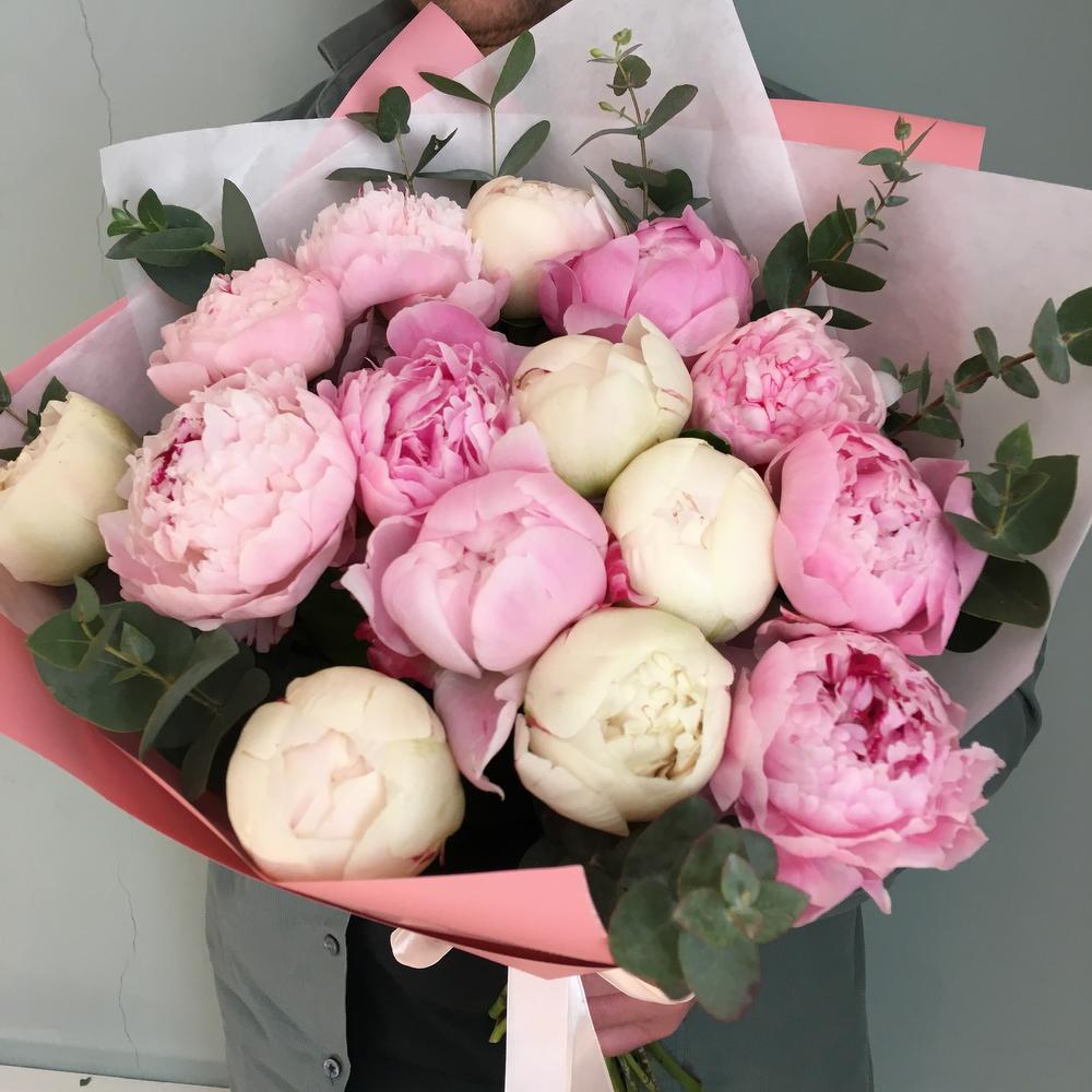 Роскошный букет из нежно розовых и сливочных пионов, 15 штук с веточками ароматного эвкалипта, в дизайнерской упаковке.Высота пионов шестьдесят сантиметров, ширина букета сорок сантиметров.Пышный и нежный букет пионов никого не оставит равнодушным.Стильное цветочное решение для любого случая.Отличный выбор для подарка на день всех влюблённых, 14 февраля.