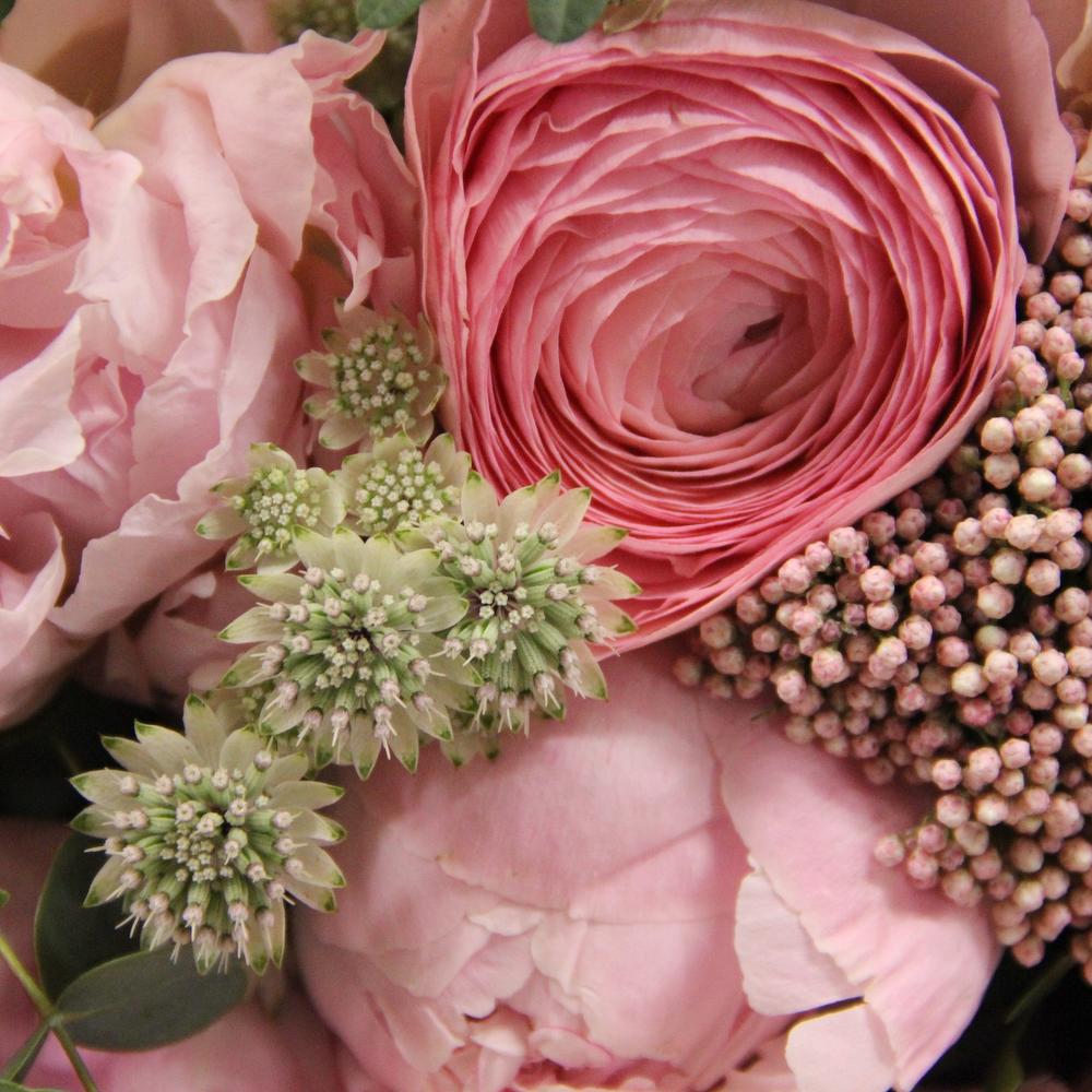 Букет из пионов и ранункулюсов, маттиолы и астранции, эвкалипта и озотамнуса.Стильное цветочное решение для любого случая.