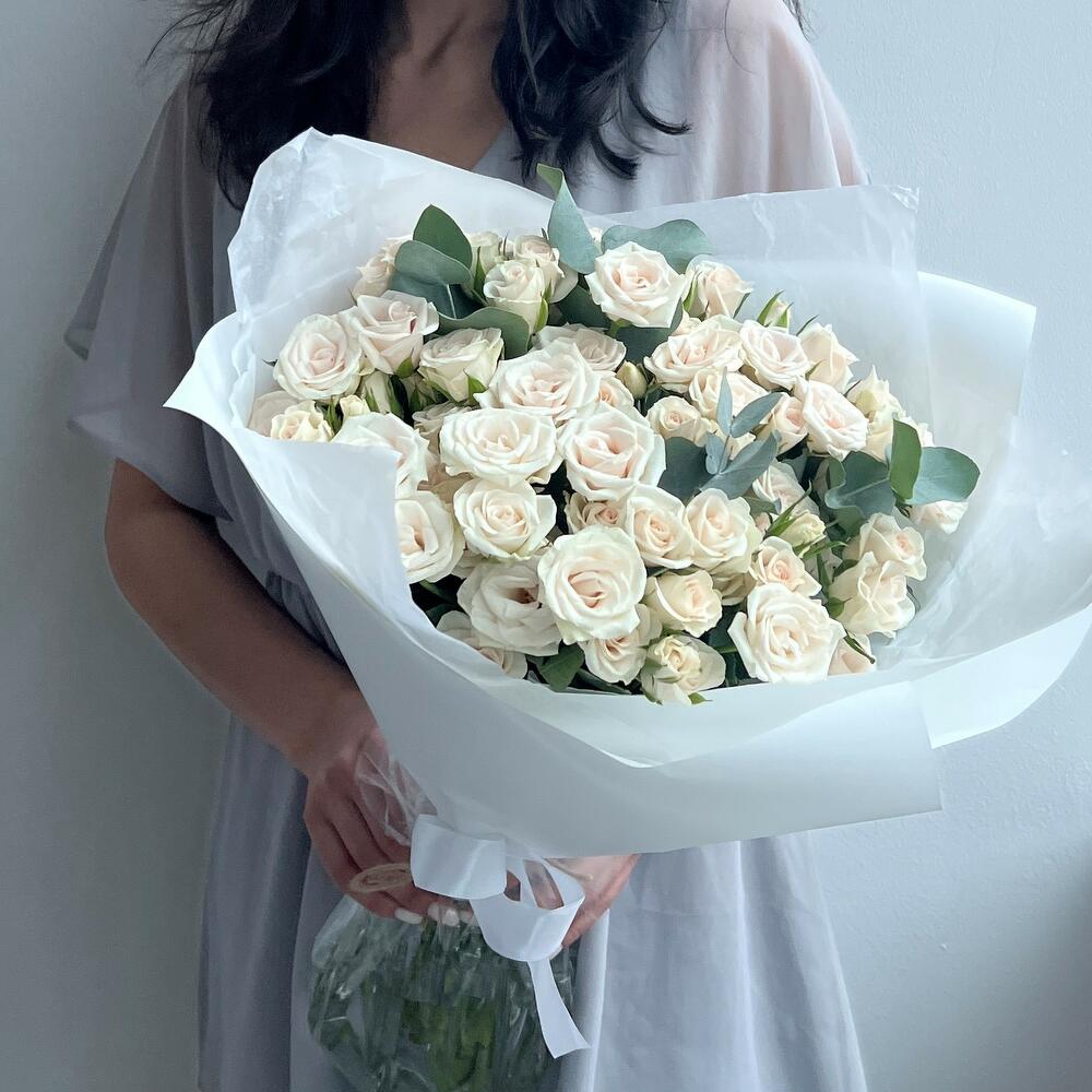 Роза кустовая – 15 шт.Эвкалипт – 3 шт.Упаковка дизайнерская – 2 шт.
