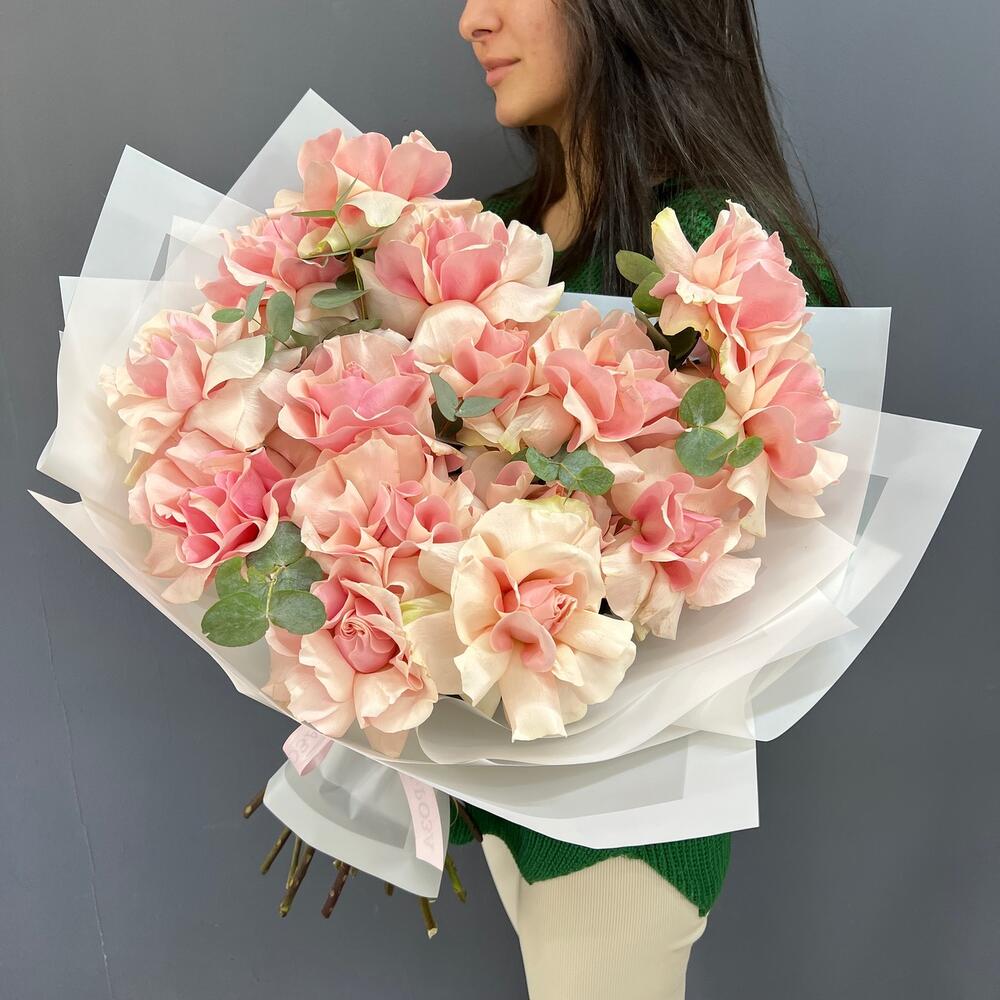 15 нежно-розовых французских роз с эвкалиптом
