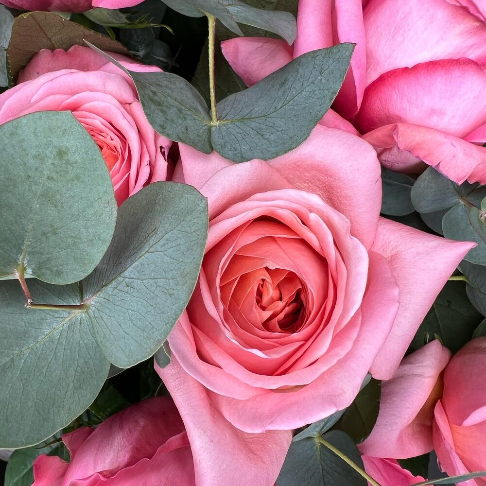 Эвкалипт – 2 шт.Роза пионовидная – 15 шт.комплимент от polyanka – 1 шт.