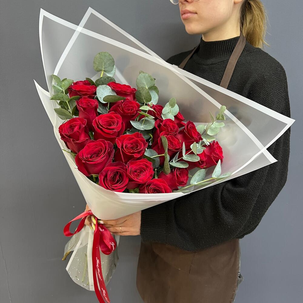 21 красная роза с эвкалиптом