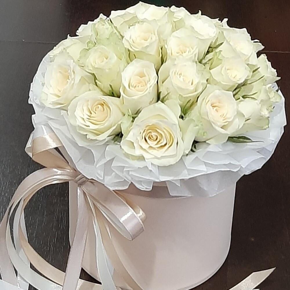 25 белых роз в шляпной коробке