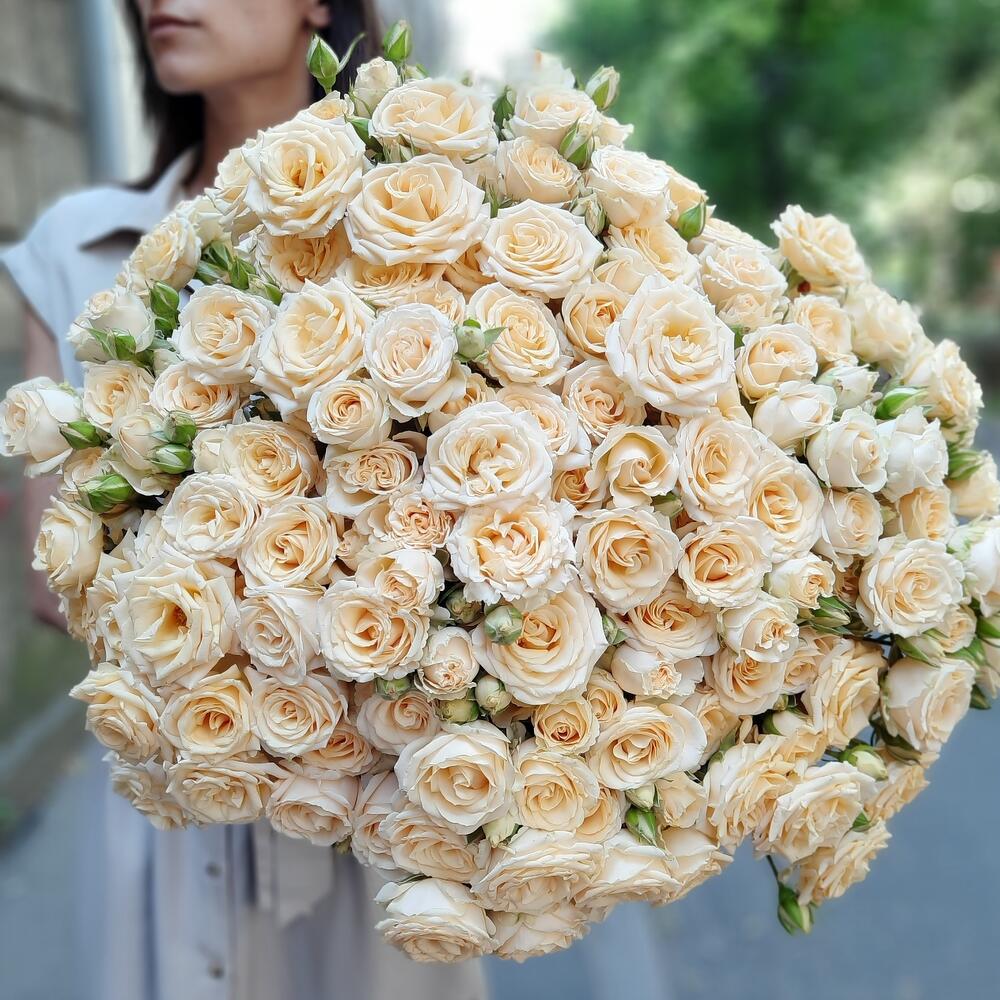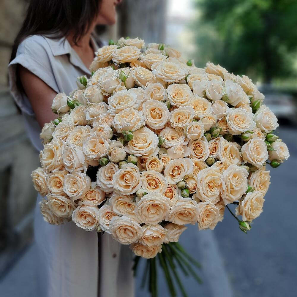 роза кустовая кремовая 60 см – 25 шт.упаковка дизайнерская в подарок – 2 шт.Лента органза – 1 шт.