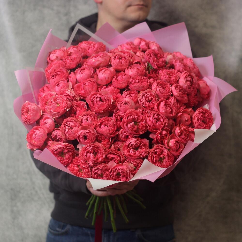 Роза кустовая пионовидная – 25 шт.Упаковка дизайнерская – 8 шт.Лента атласная – 1 шт.