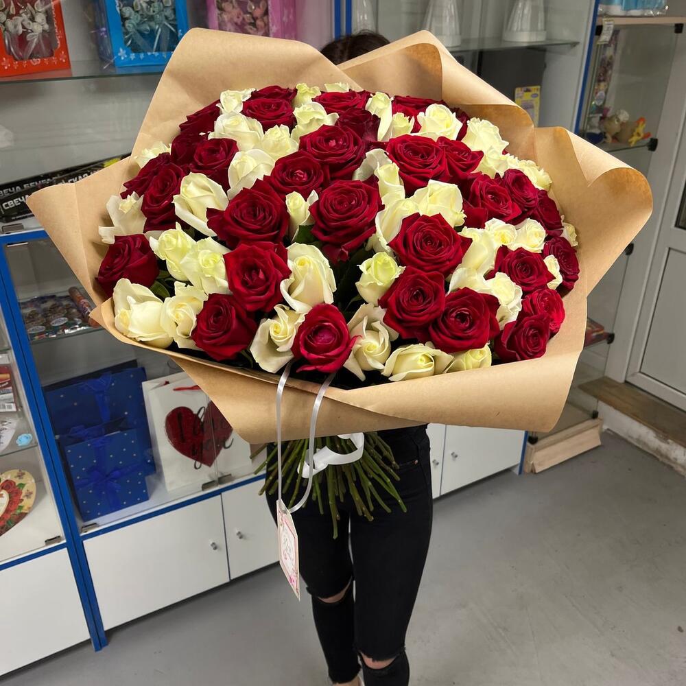 розы эквадор (60 см) – 75 шт.Крафт – 2 шт.Лента атласная – 1 шт.