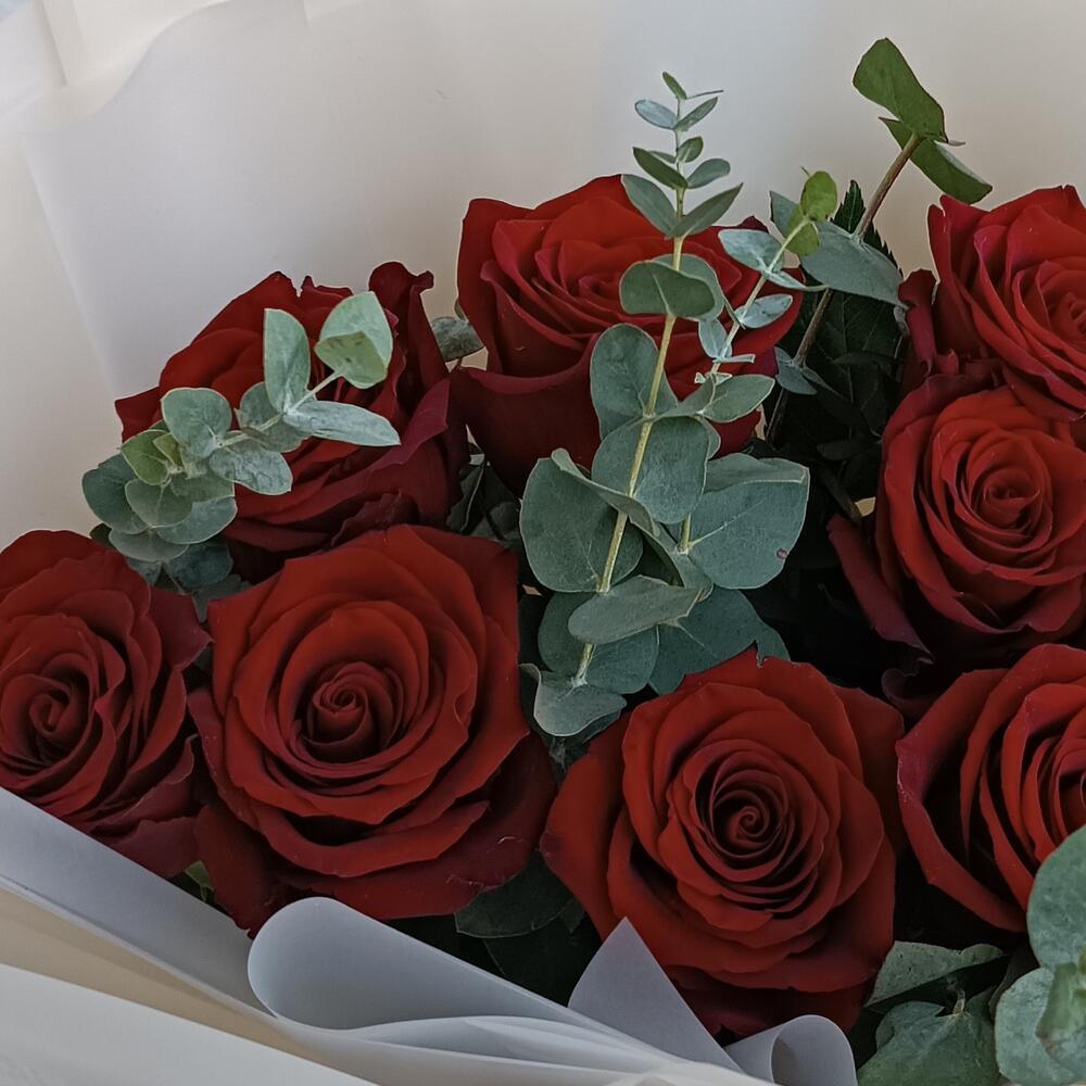 Самый страстный классический вариант бордовых роз с крупным бутоном и ароматным эвкалиптом. Такой букет расскажет о ваших чувствах , подойдет для любого повода (день рождения , юбилей, просто выражение симпатии)