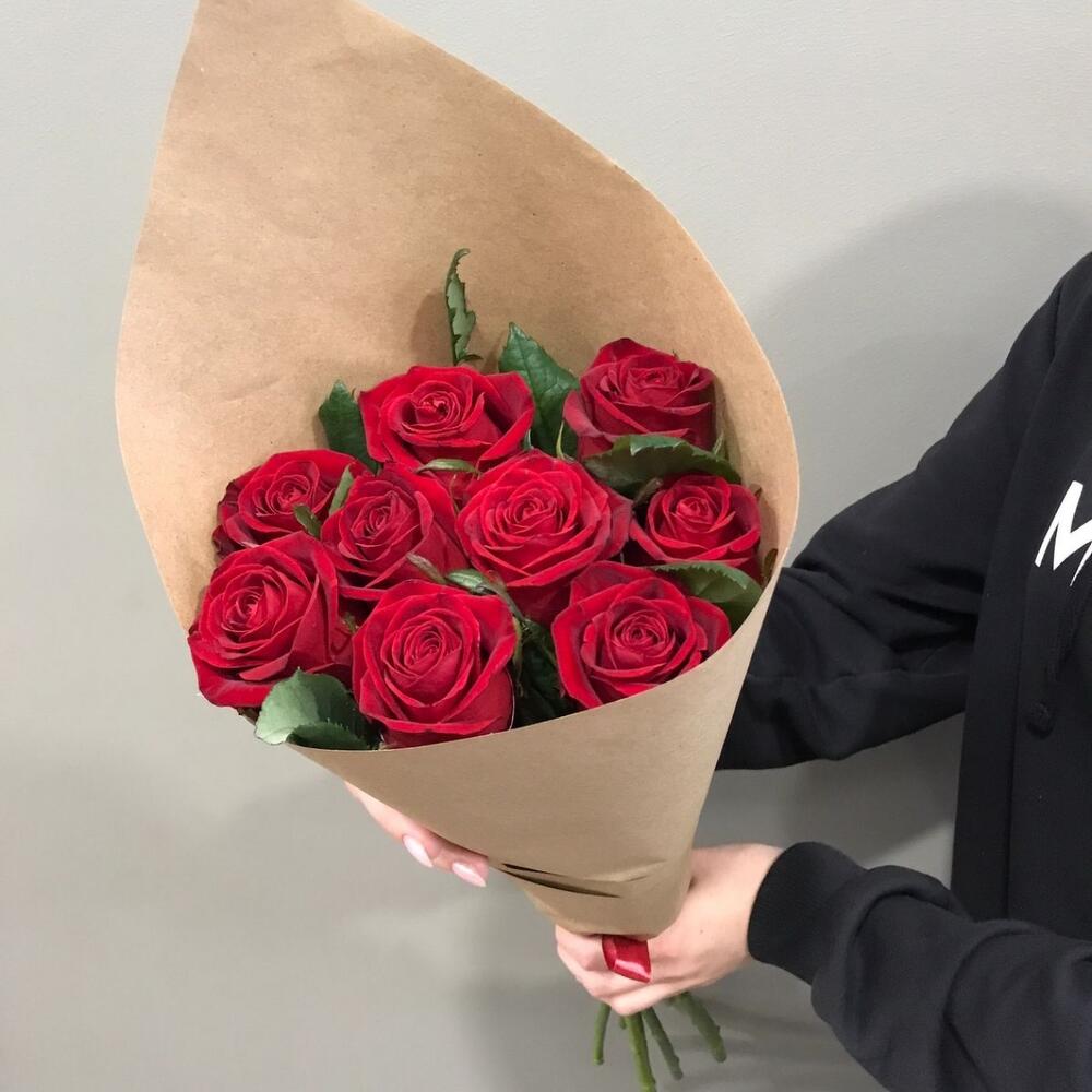 Лента атласная – 1 шт.Роза красная 60 см – 9 шт.Крафт упаковка – 1 шт.
