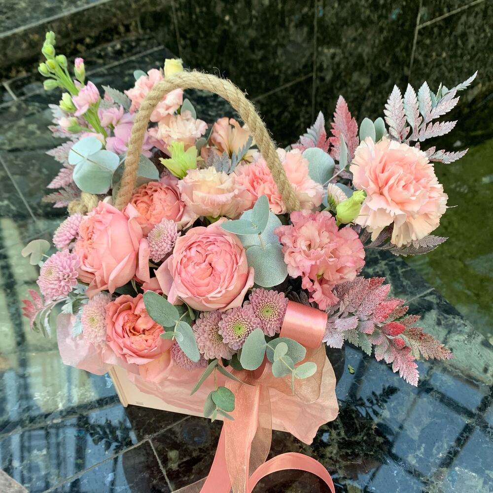 Лизиантус – 1 шт.Маттиола – 1 шт.Папоротник – 1 шт.Сантиния – 1 шт.Диантус розовый – 2 шт.джульетта роза пионовидная – 1 шт.