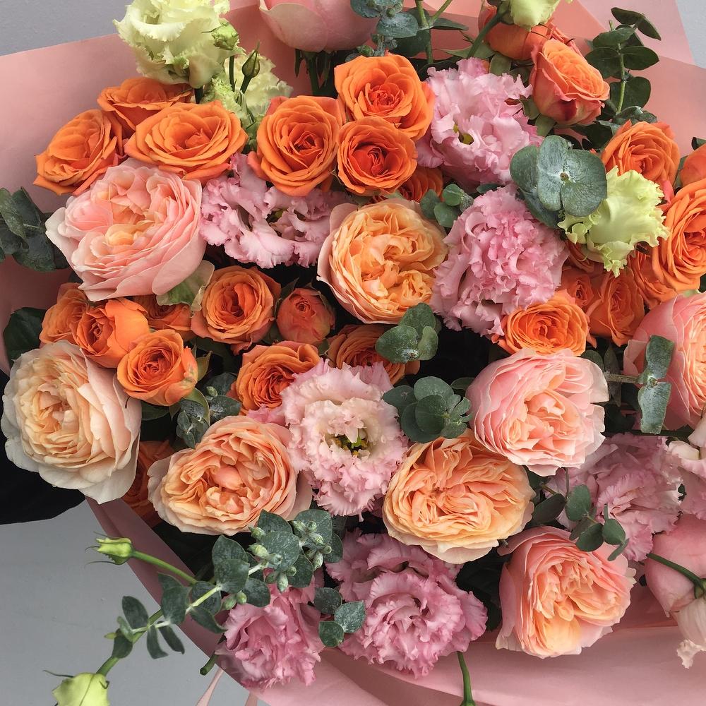 Роза пионовидная – 9 шт.Роза кустовая – 5 шт.Лизиантус – 9 шт.Эвкалипт – 9 шт.Упаковка – 3 шт.Лента атласная – 2 шт.