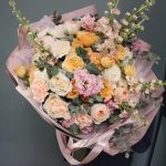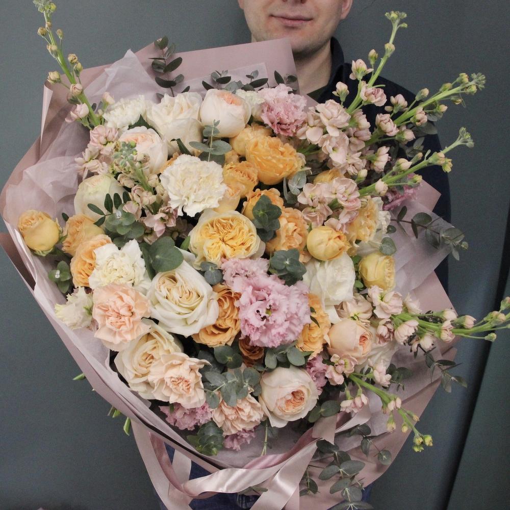 Маттиола – 7 шт.Лизиантус – 7 шт.Роза кустовая пионовидная – 3 шт.Роза пионовидная – 9 шт.Диантус – 9 шт.Эвкалипт – 9 шт.Фисташка – 5 шт.Тишью – 3 шт.Бумага – 3 шт.Лента атласная – 3 шт.