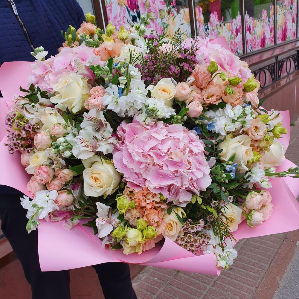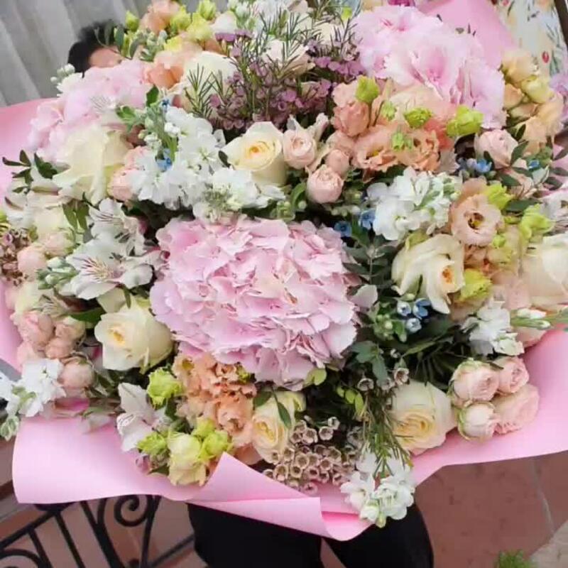 Гортензия розовая – 3 шт.Альстромерия – 10 шт.Маттиола – 10 шт.Лизиантус – 10 шт.Кустовая роза – 10 шт.Твидия – 12 шт.Роза Эквадор – 15 шт.Ваксфлауэр – 5 шт.Фисташка – 10 шт.Упаковка дизайнерская – 2 шт.