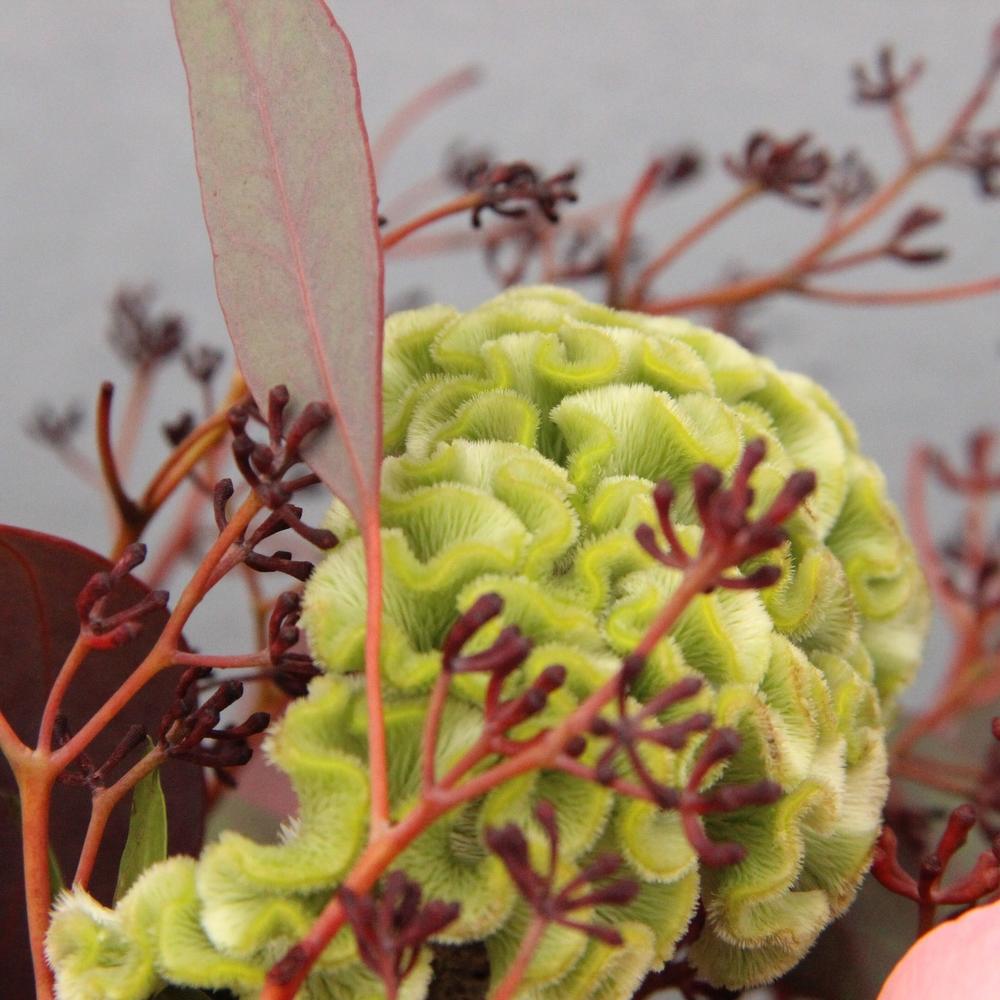 Георгина – 2 шт.Роза кустовая пионовидная – 1 шт.Роза пионовидная – 2 шт.Роза сортовая – 2 шт.Амми – 1 шт.Эвкалипт – 4 шт.фисташка зелень – 2 шт.Лента атласная – 1 шт.