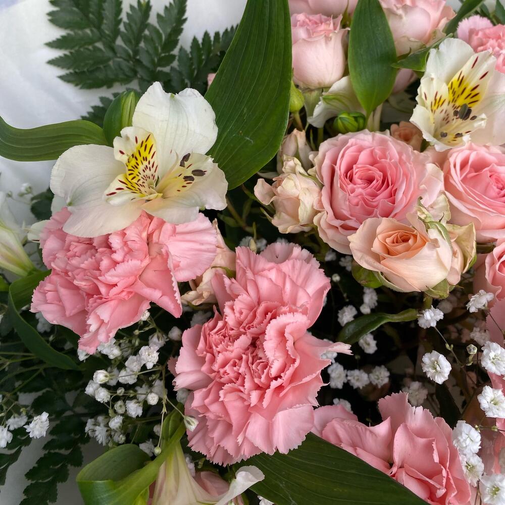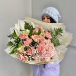 Альстромерия – 2 шт.Гипсофила – 2 шт.Гортензия – 1 шт.Папоротник – 4 шт.Роза кустовая – 3 шт.Лента атласная – 2 шт.Тишью – 2 шт.Диантус – 5 шт.Упаковка дизайнерская – 5 шт.