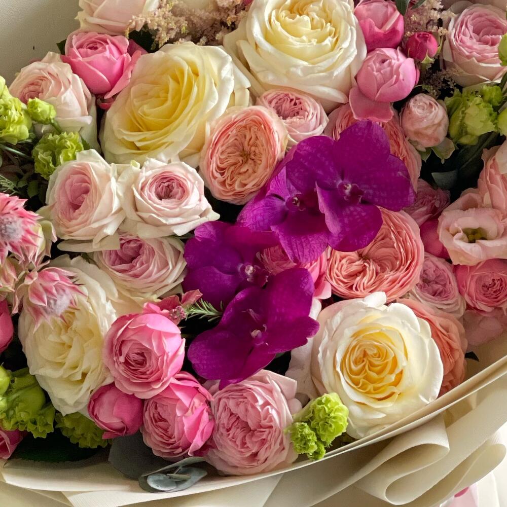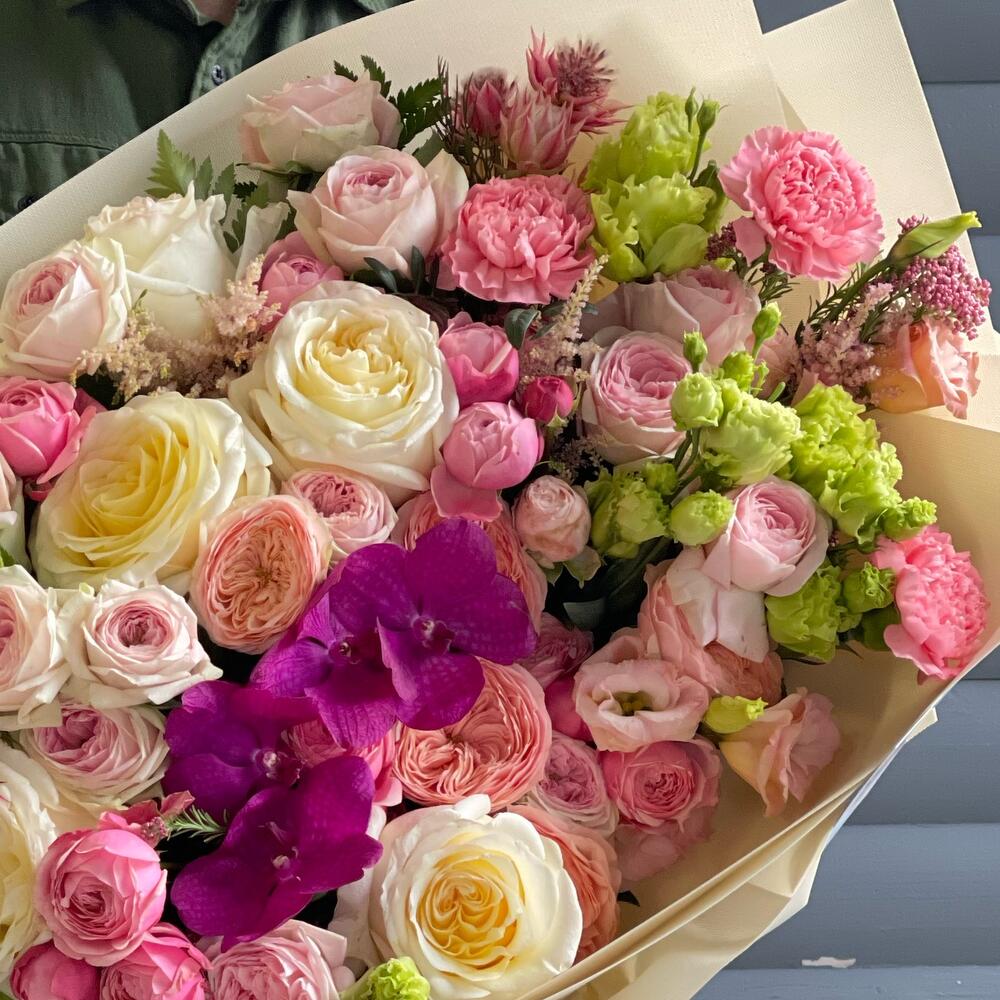 Гвоздики, Кустовые розы, Пионовидные розы, Розы