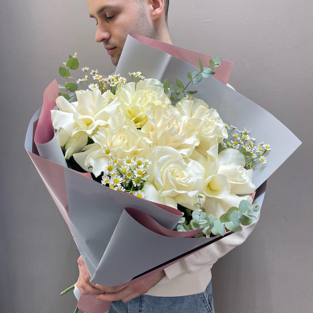Эвкалипт – 2 шт.Лента атласная – 1 шт.Матрикария – 3 шт.Упаковка дизайнерская – 1 шт.Французская роза – 7 шт.