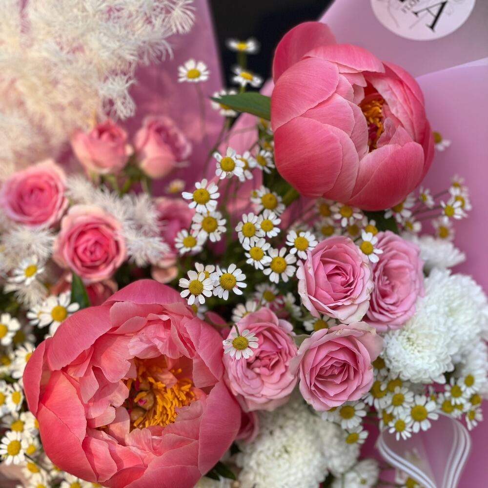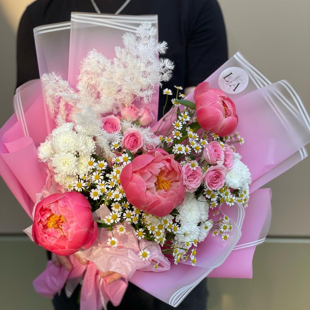 Пион – 3 шт.Хризантема кустовая – 3 шт.Кустовая роза – 2 шт.Лента атласная – 1 шт.Тишью – 1 шт.Ромашка кустовая – 5 шт.Упаковка дизайнерская – 4 шт.Аспарагус Умбелатус – 1 шт.