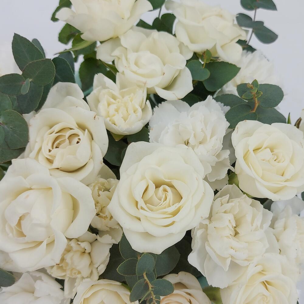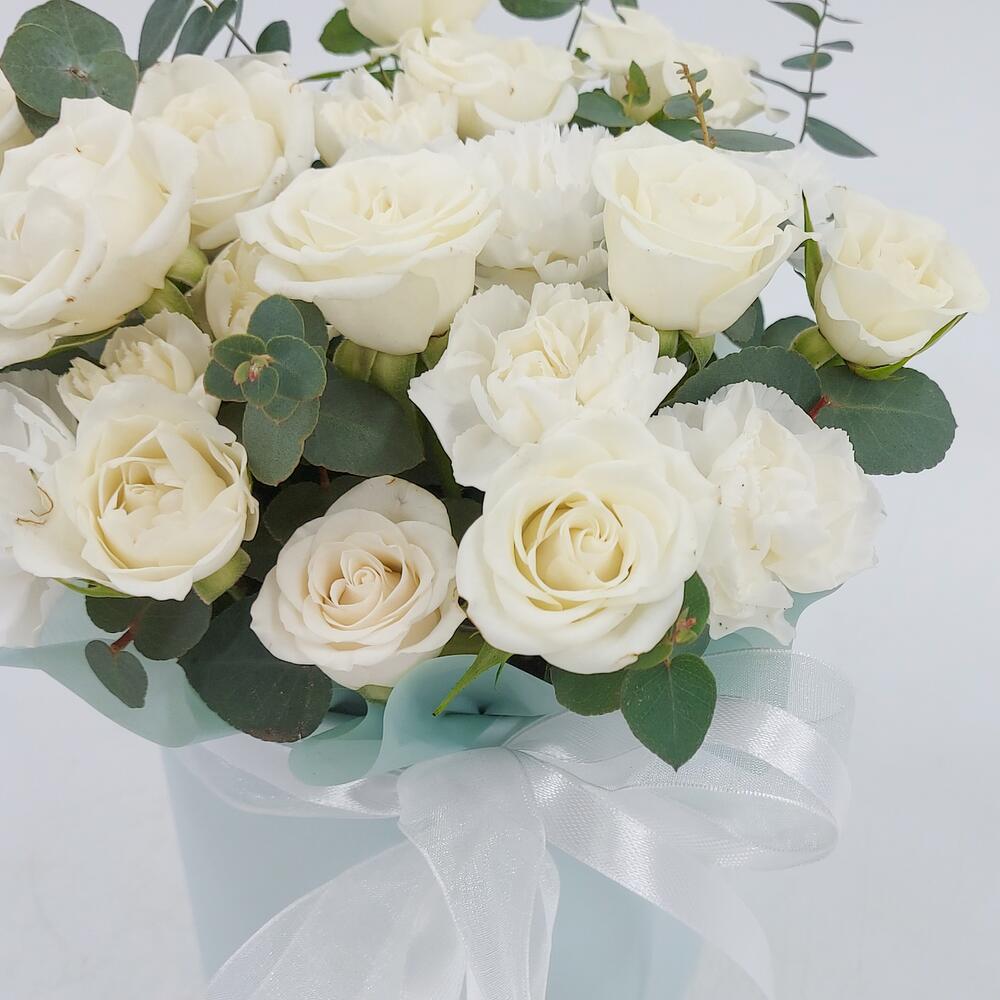 Белые кустовые розочки с эвкалиптом в коробке XS