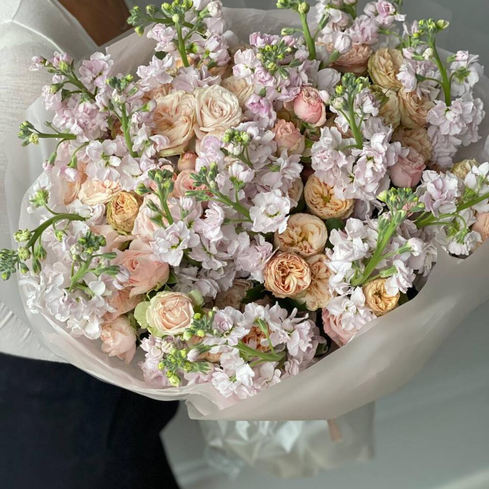 Большой, ароматный и нежный букет из маттиолы и кустовой пионовидной розы