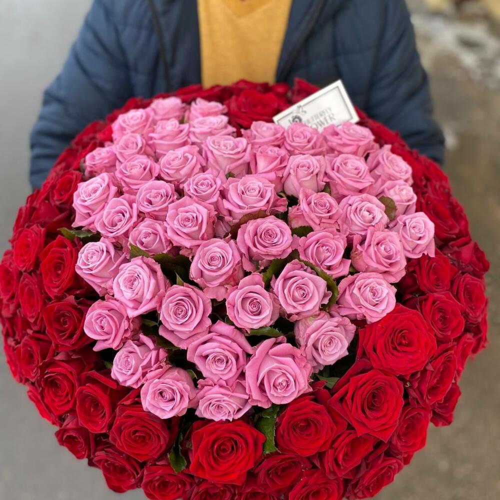 Большой букет из 151 красной и розовой розы «Преданное сердце» в дизайнерской коробке