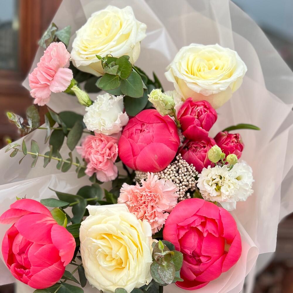 Озотамнус – 1 шт.Эвкалипт – 4 шт.Лента атласная – 2 шт.Диантус – 3 шт.Тюльпан пионовидный – 3 шт.Пленка матовая – 7 шт.эустома махровая белая – 1 шт.Пион коралл шарм – 3 шт.роза кэндллайт – 3 шт.